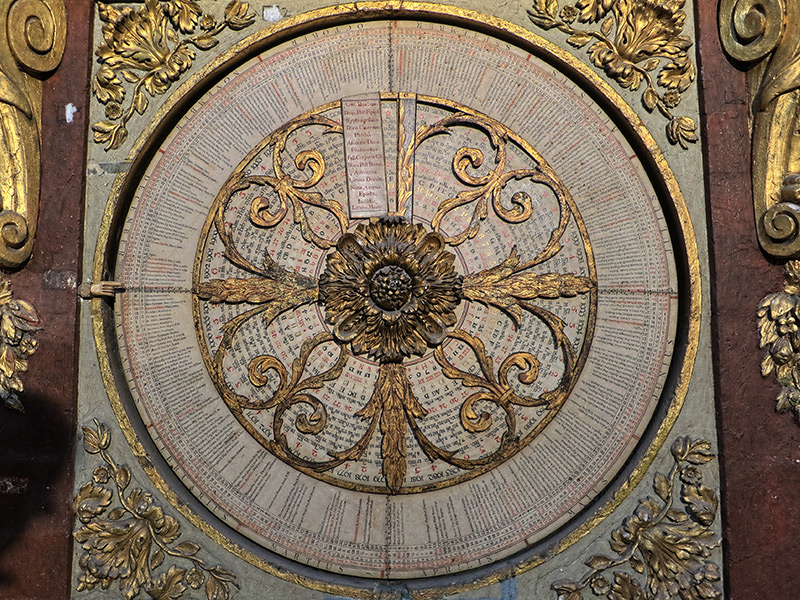 Anzeigen: Mondphase, (Sonne im) Tierkreis, Drehung des Himmels, Kalenderscheibe, Mondalter, Mondlauf. Bauart: Große Innen-Uhr. Mondphase: Kugel. Subtyp: Astrolab südlich. Typ: Astrolabium. Zustand: intakt.