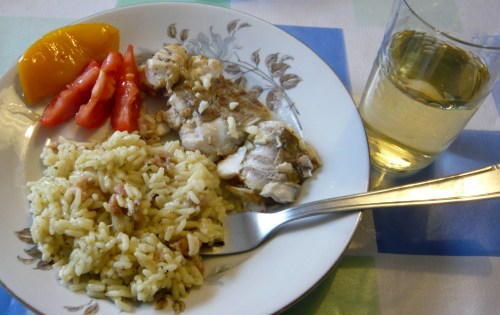 Fisch in Portionen auf dem Reis anrichten und servieren. Dazu passt Weißwein.